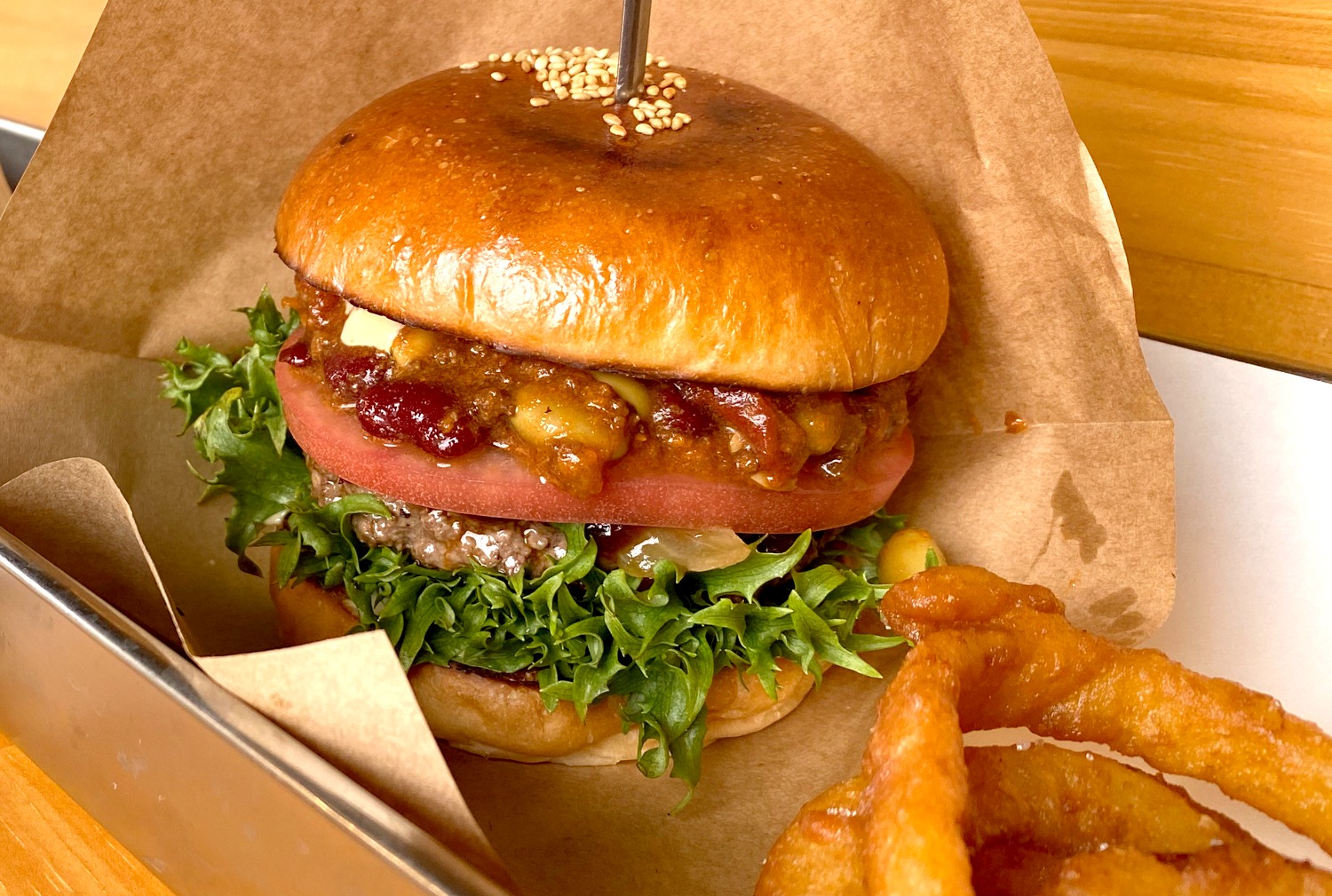 「CowBurgers(カウバーガーズ)」は、2022年6月にオープンしたハンバーガー店です。福島市内にある日本料理店「和肴ごとく」店主の阿部俊光さんが、オーナー兼シェフを務めています。 ハンバーガーのパテには、二本松市の「エム牧場」で育てられた希少な短黒牛(黒毛和牛×短角牛)と経産牛(生体熟成和牛)を使用。バンズは市内のパン屋「BAKERY Tsuchi-Pain(つちぱん)」から仕入れ、具材に県産の野菜や果物も加えるなど、地元の食材にこだわっています。 売れ筋No.1は、店の名前を冠した「COW BURGER」。うまみたっぷりの粗挽きパテと自家製のベーコン、トマト、レタスを挟んだ王道のハンバーガーです。ほかにも県産の枝豆をたっぷり使った「チリビーンズBURGER」や、季節のバーガーなど、常時6種類を取り揃えています。メニューはすべてテイクアウトOK。 鉄工所跡をリノベーションしたイートインスペースは、天井が高く、アメリカ風のスタイリッシュな空間。鉄工所の作業台をテーブルに作り替えたり、クレーンをそのままインテリアにしたりと、操業時の面影も残しました。 「『和肴ごとく』で提供している厳選した食材を使って、こだわりのバーガーをつくりました。店内の雰囲気とあわせて、ぜひ楽しんでもらいたいですね」と阿部さんは話します。 店は、福島交通飯坂線と東北本線に挟まれた場所にあって、飯坂電車をはじめ様々な車両の通過を目の前で眺められることから、電車好きのお子様にも人気。また愛犬を連れて入店できるため、「ワンちゃんと一緒にくつろげる」と愛犬家の方々にも好評です。